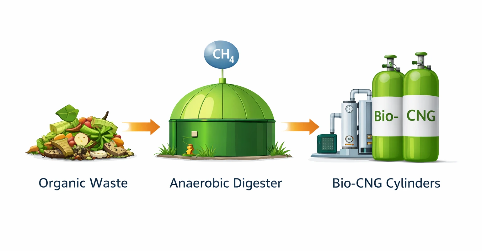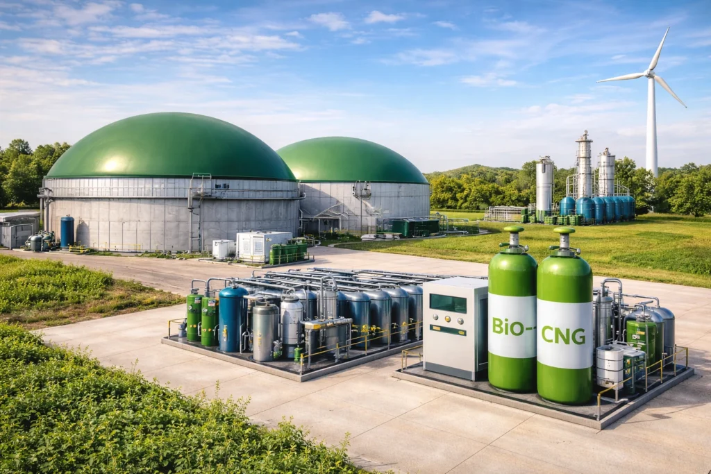 Biogas is a renewable fuel produced through a biological process known as anaerobic digestion. In this process, microorganisms break down organic materials such as agricultural waste, food waste, animal manure, and municipal organic waste in an oxygen-free environment. During decomposition, a mixture of gases is produced, mainly methane (CH₄) and carbon dioxide (CO₂).