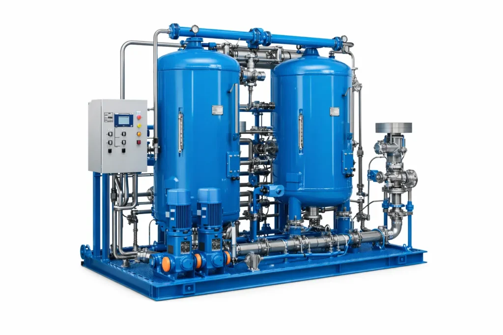 A Condensate Polishing Unit (CPU) is a key component of an Effluent Treatment Plant (ETP), used to purify condensate from boilers and industrial processes. it removes dissolved impurities, suspended solids, and ionic contaminants, making water suitable for reuse or discharge. The unit uses ion exchange resins to eliminate salts, silica, hardness, and organics, improving water quality. Integrating a CPU in an effluent treatment plant reduces fresh demineralized water usage, saving energy and costs while protecting equipment.